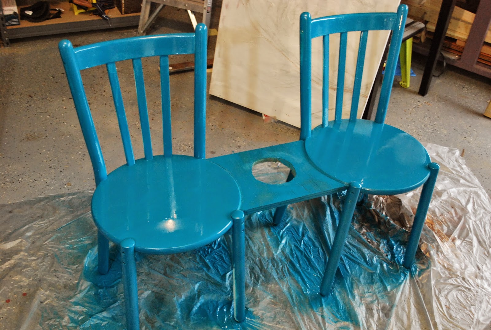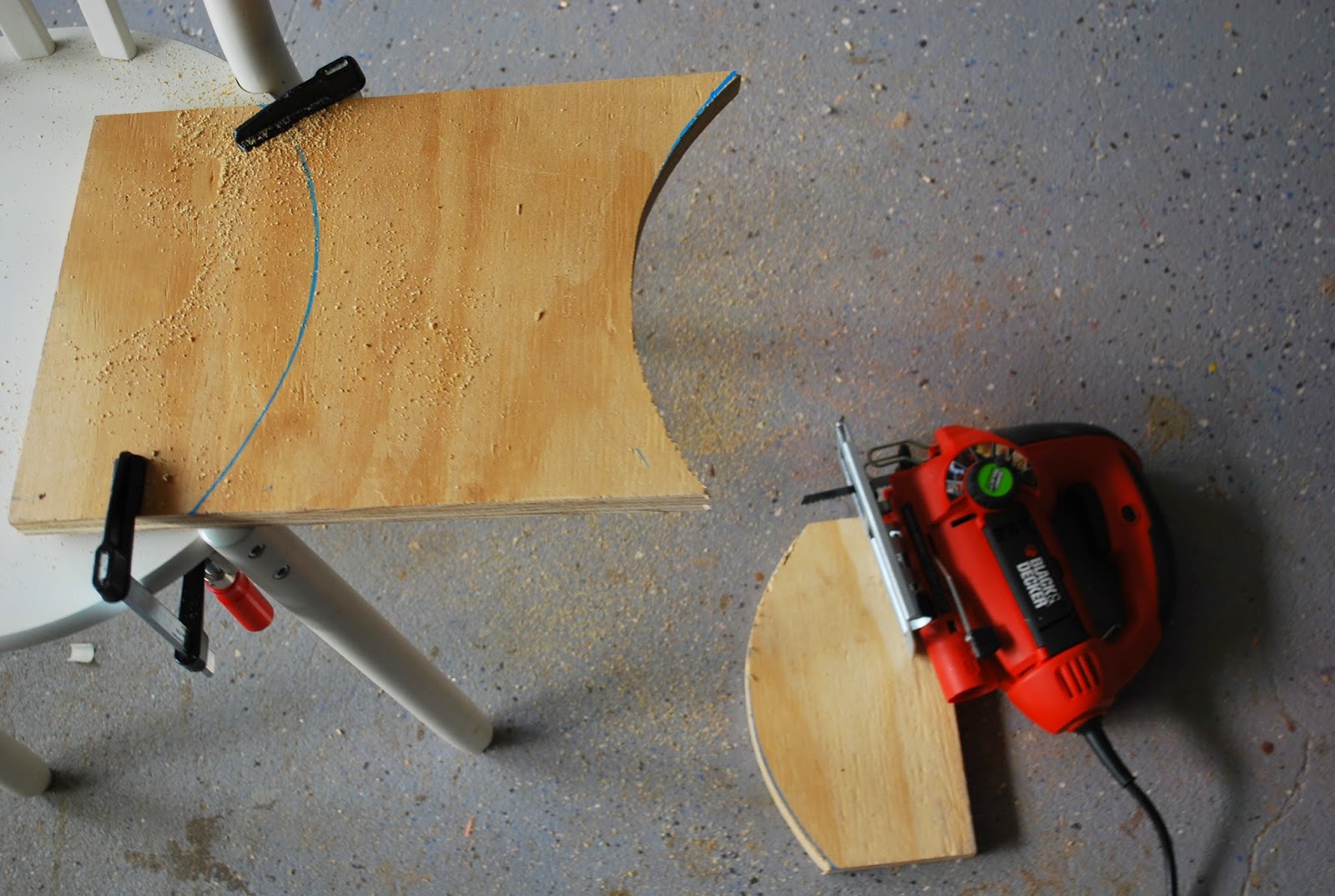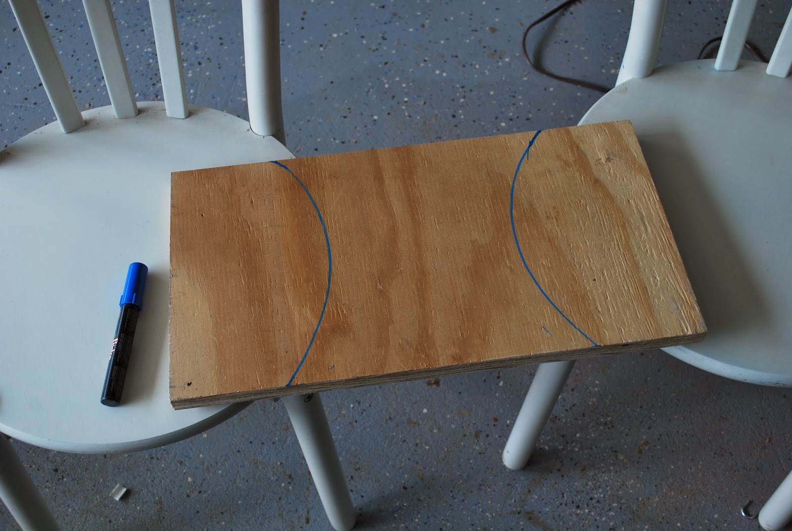 This project was incredibly easy and simple. I really just used what I already had. Using a scrap piece of plywood I cut out curved edges to connect between the rounded edges of the two chairs