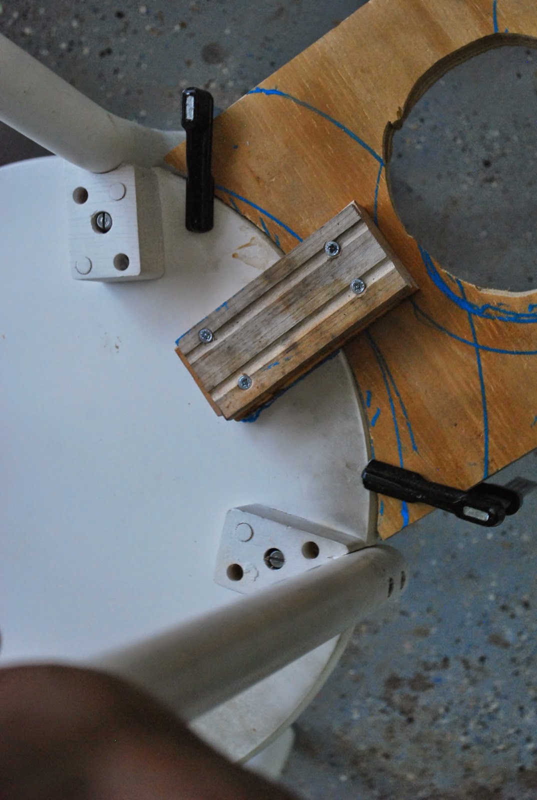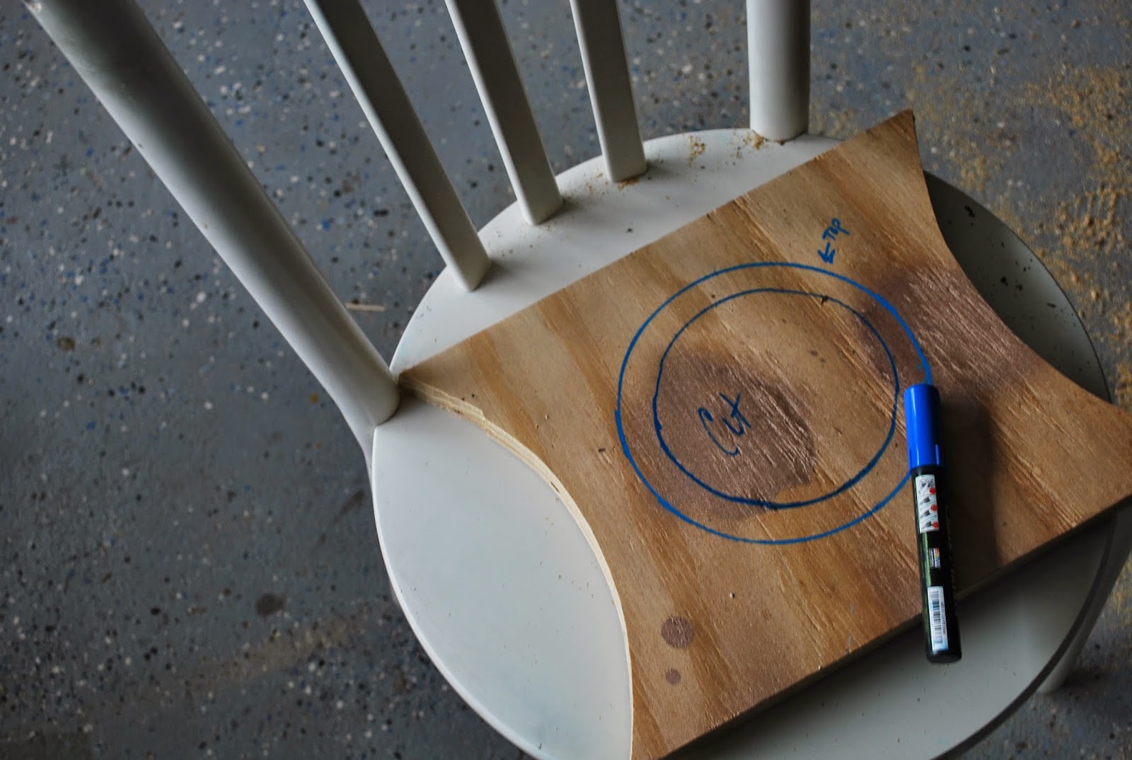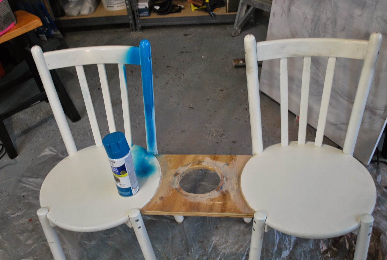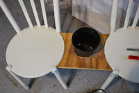 This project was incredibly easy and simple. I really just used what I already had. Using a scrap piece of plywood I cut out curved edges to connect between the rounded edges of the two chairs