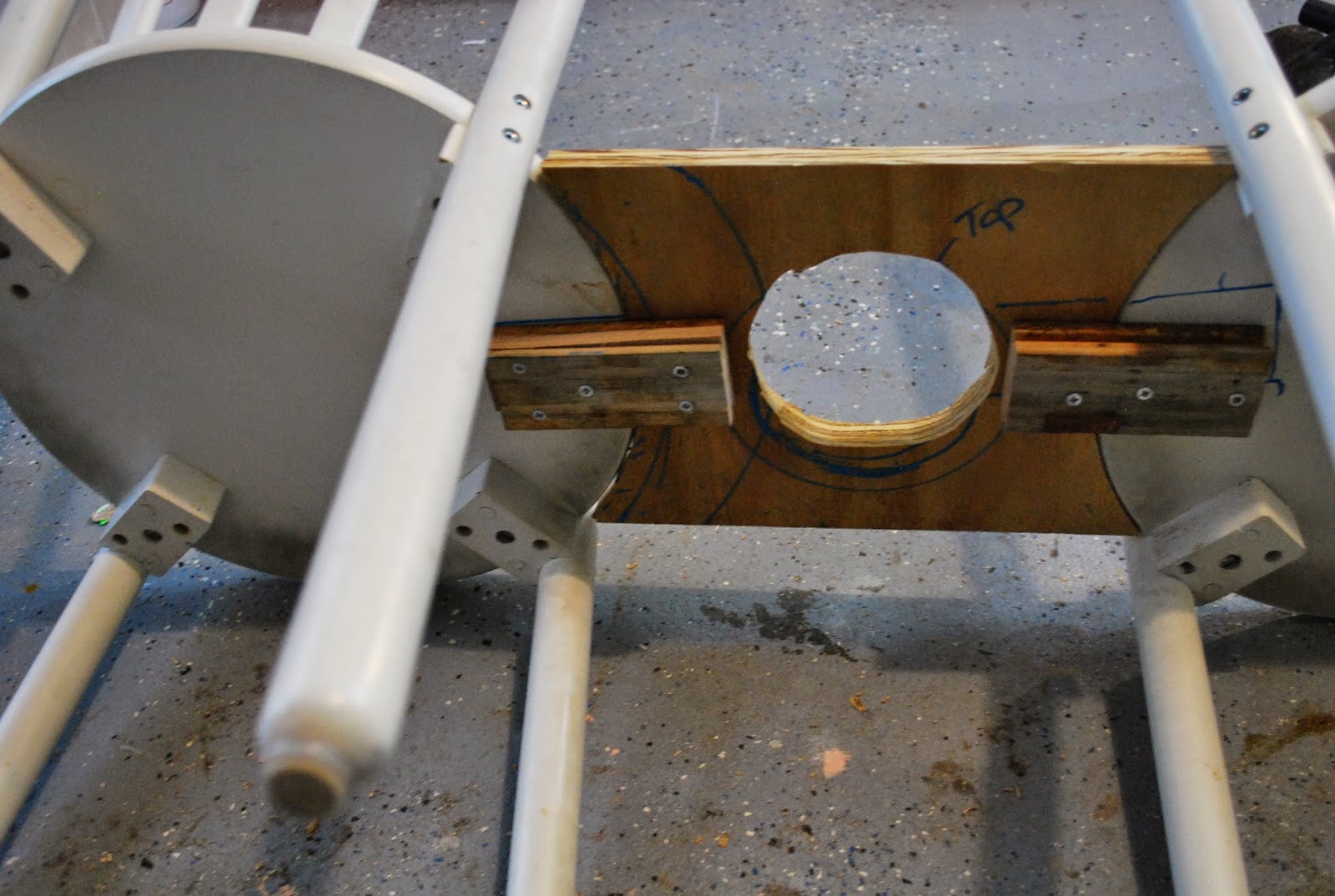 Then I attached the plywood to each chair connecting the two chairs. I cut down some old maple flooring I had to act as support under the connecting plywood.