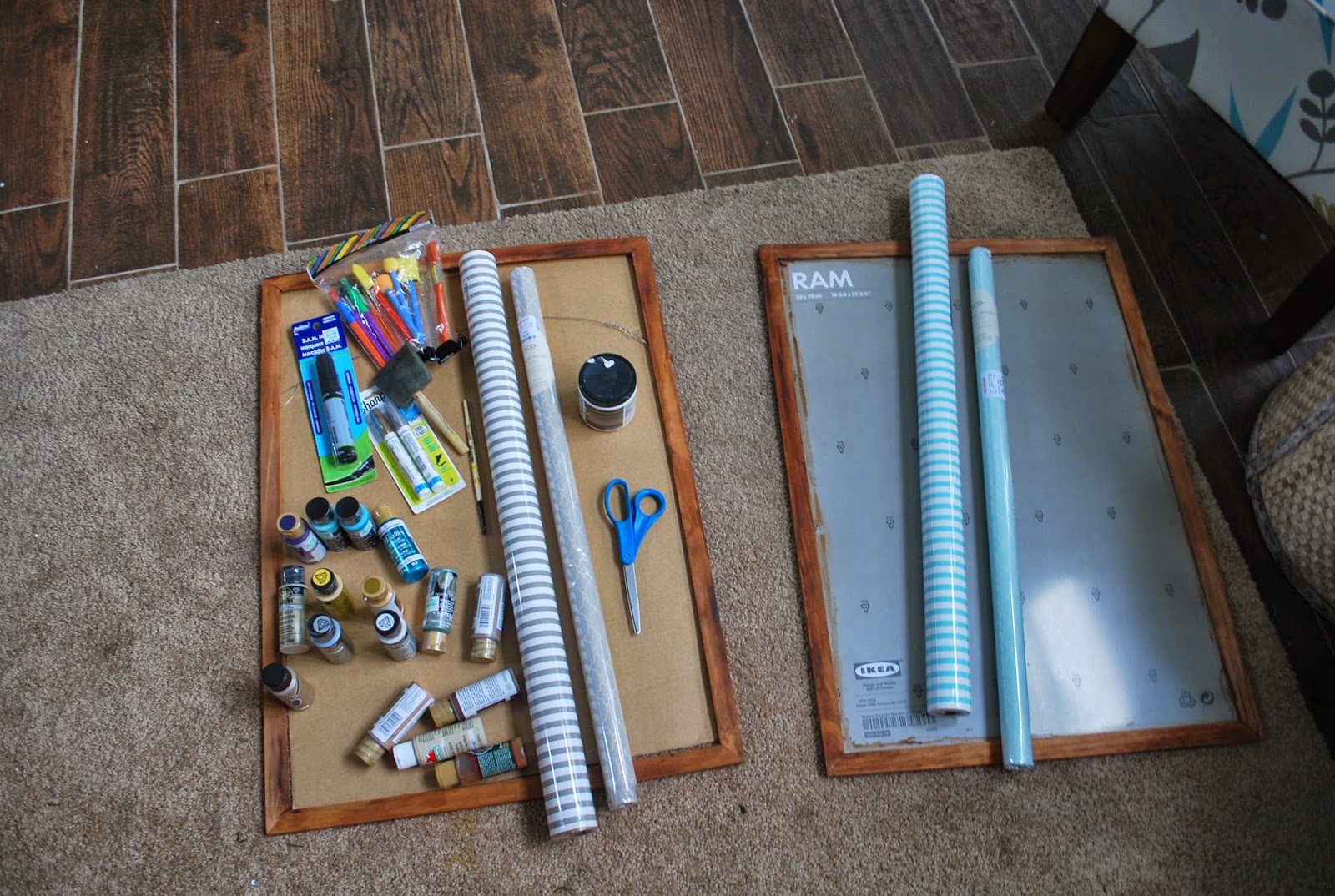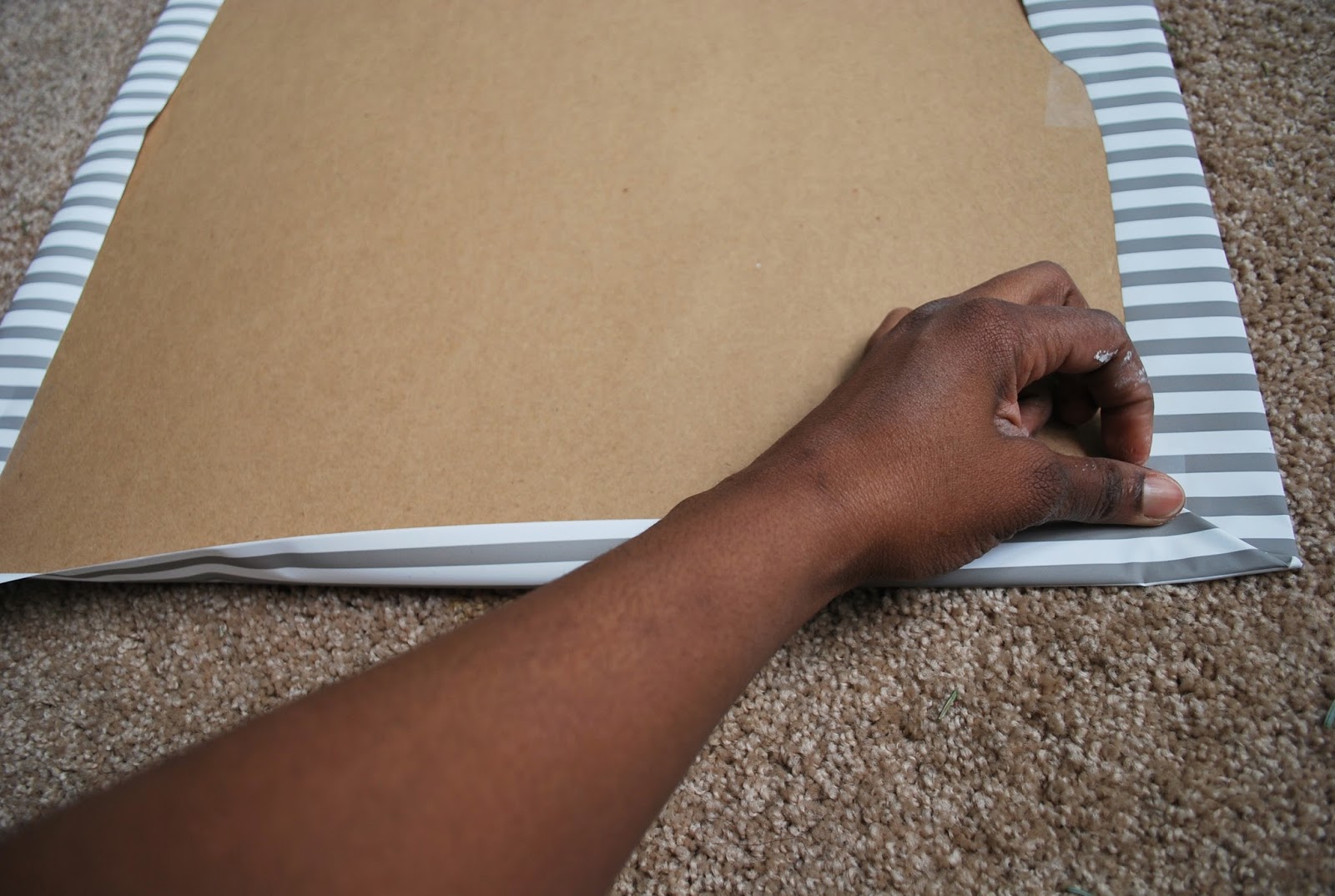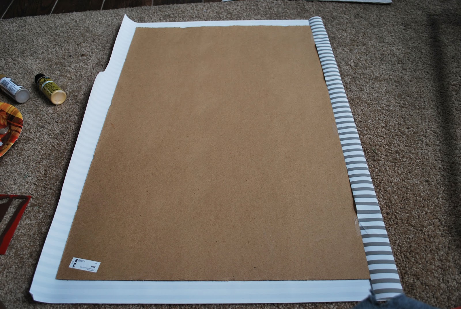 Roll out the gift wrapping paper onto the cardboard backing that comes with the frame. Cut and tape in place.