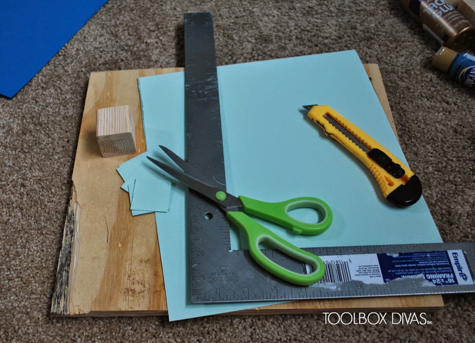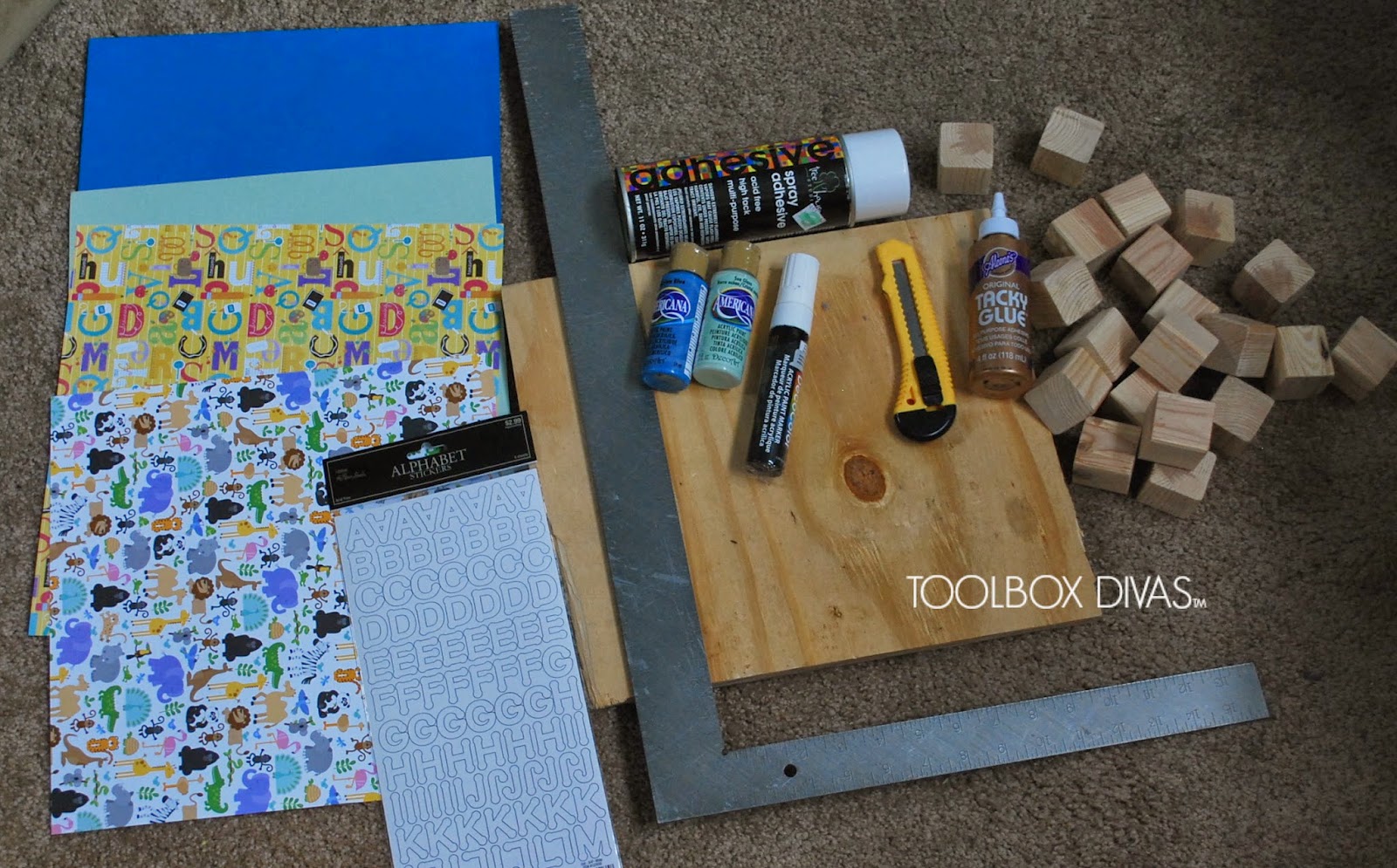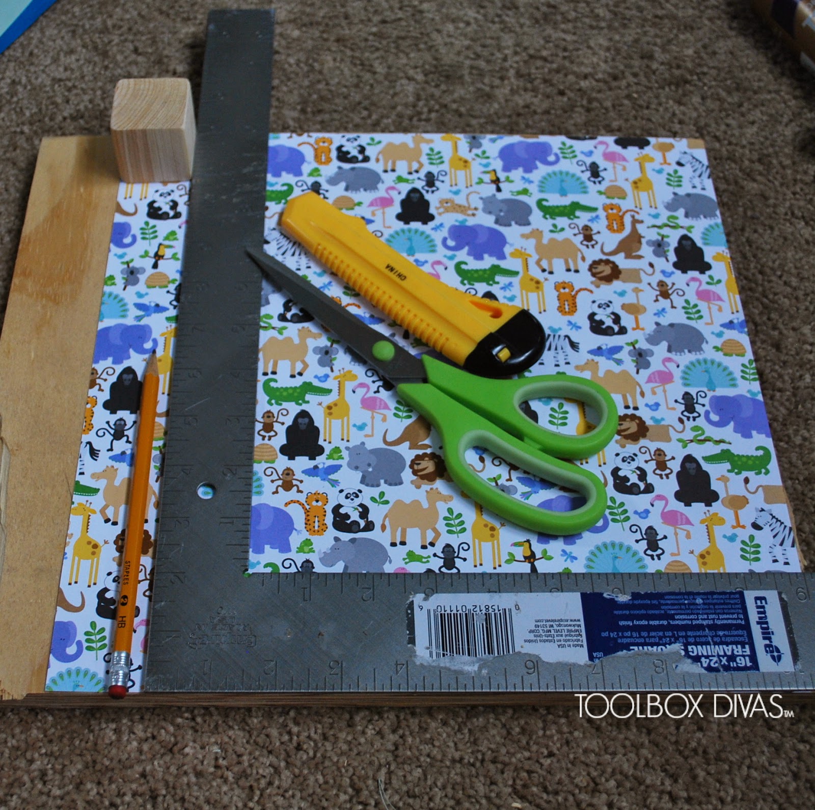 Now its time to cut all the scrapbooking paper to size so that it can be glued to the blocks. ANddddd….It would appear I’m becoming more garage than crafty these days. I used a piece of plywood as my cutting board and an utility knife to make straight cuts and an L-square to line up my cuts. Umm…. I’m happy to report after this project I went out and bought a paper cutter.
