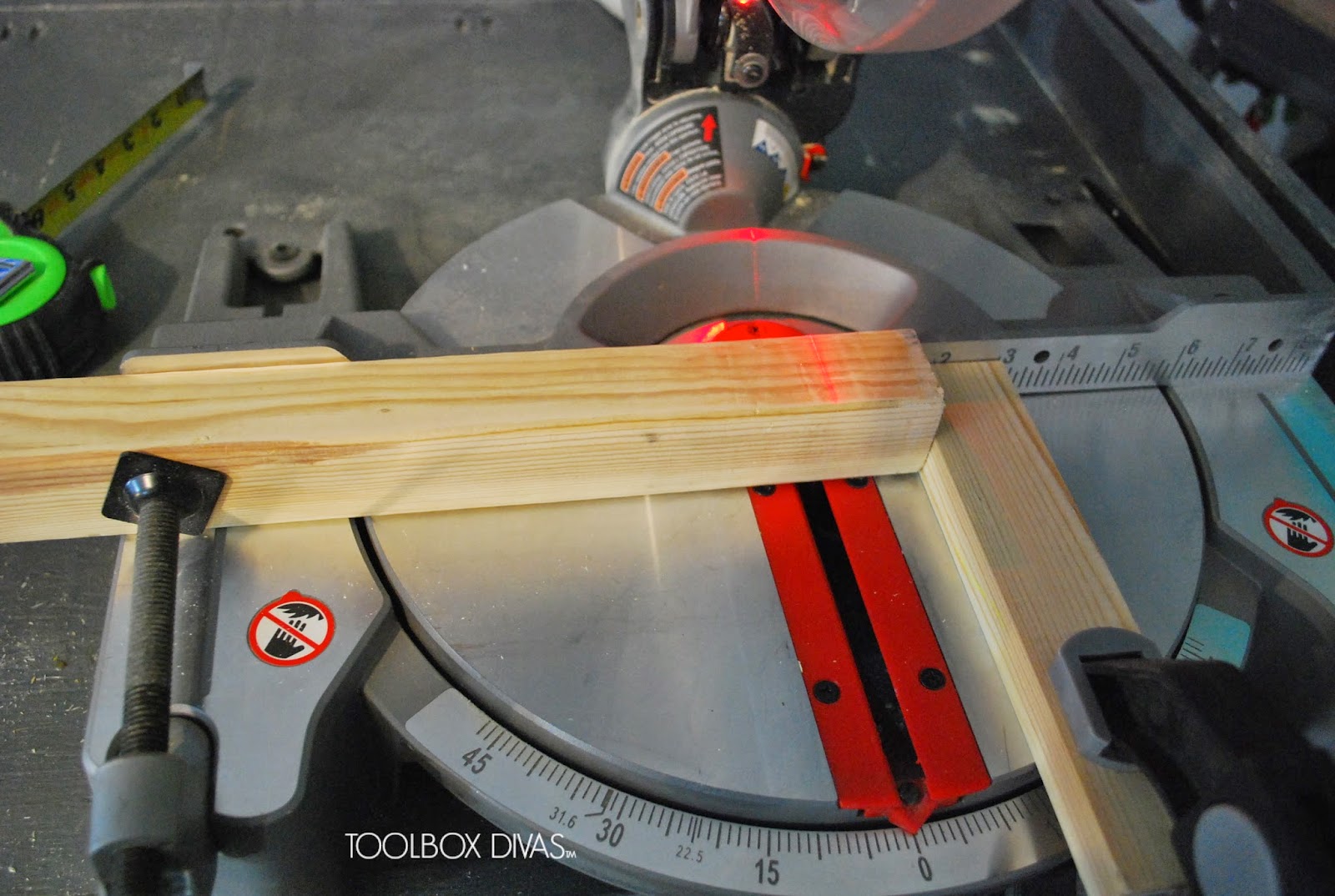In my case I’m using my miter saw for speed and convenience but this can totally be accomplished with a regular hand saw. If using a miter saw or box or cutting by hand you can use a stop block because all of the cuts are to be exact and its a repetitive process. Be sure not to over tighten the safety clamp.