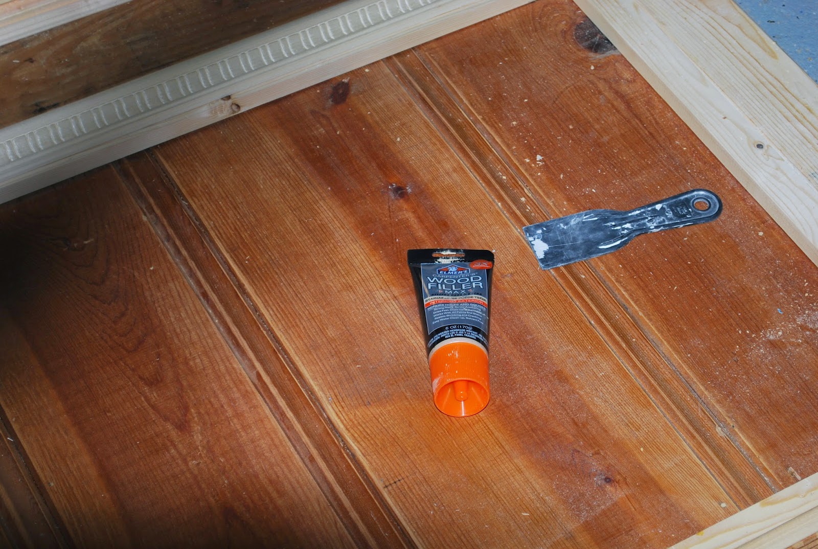 Now it’s time to clean up this headboard. I used reclaimed wood. So it naturally had its nicks and scrapes. Using wood filler and a putty knife fill in the holes and “imperfections.”