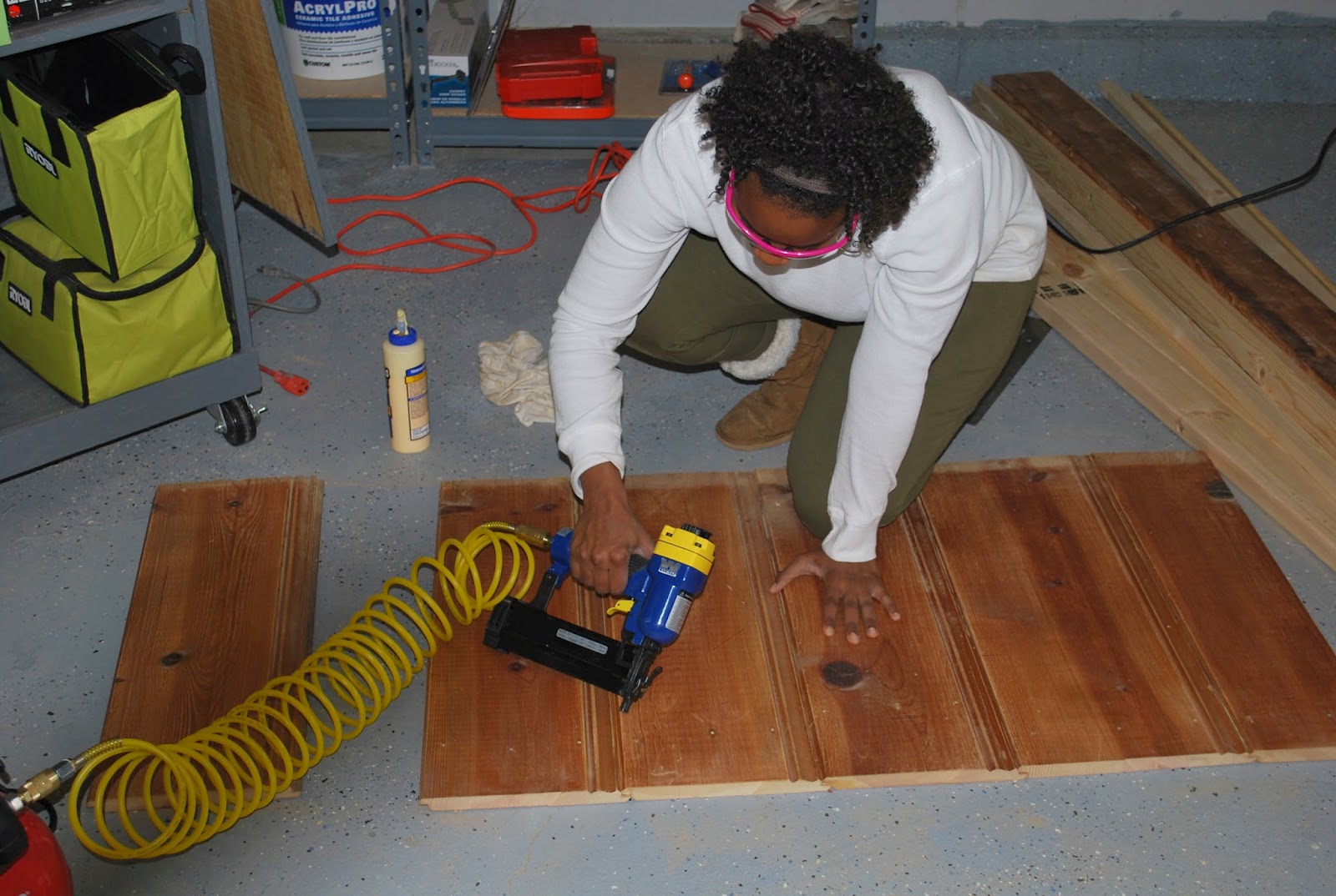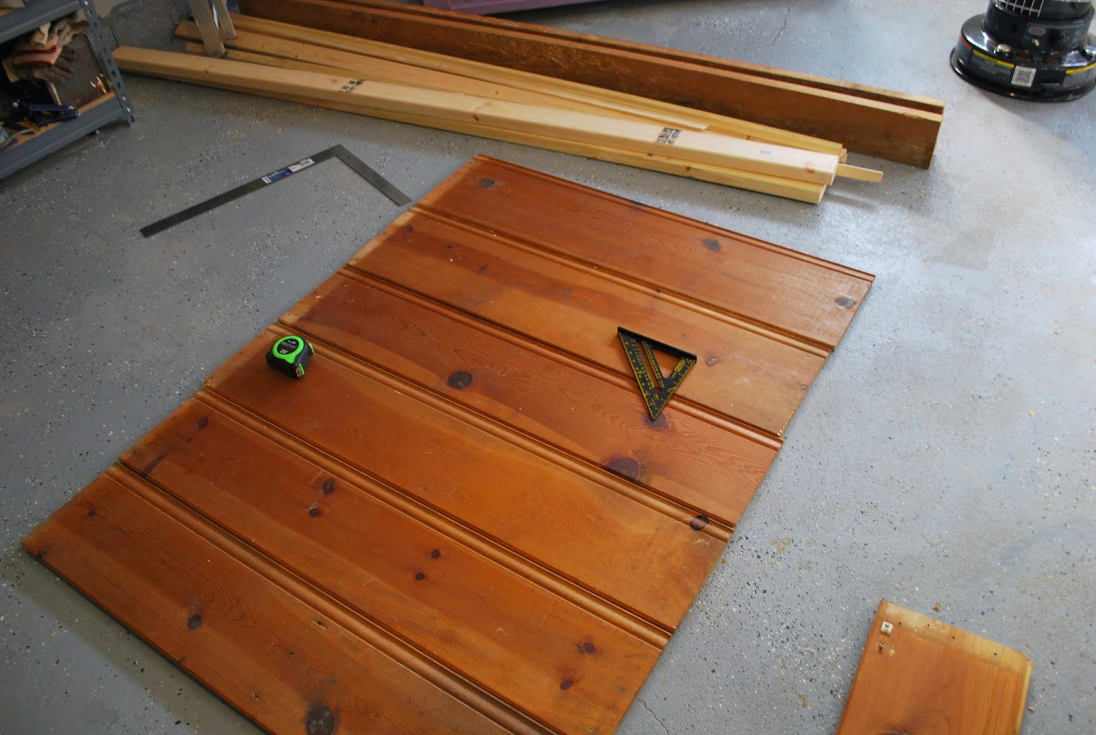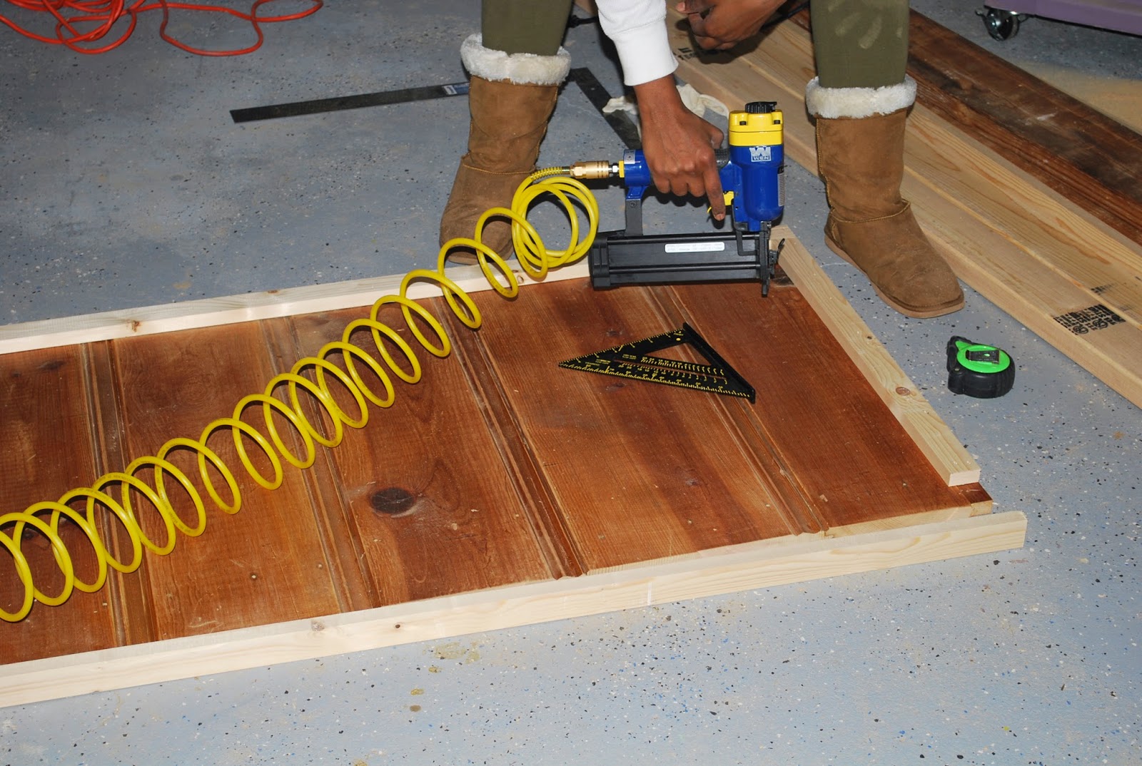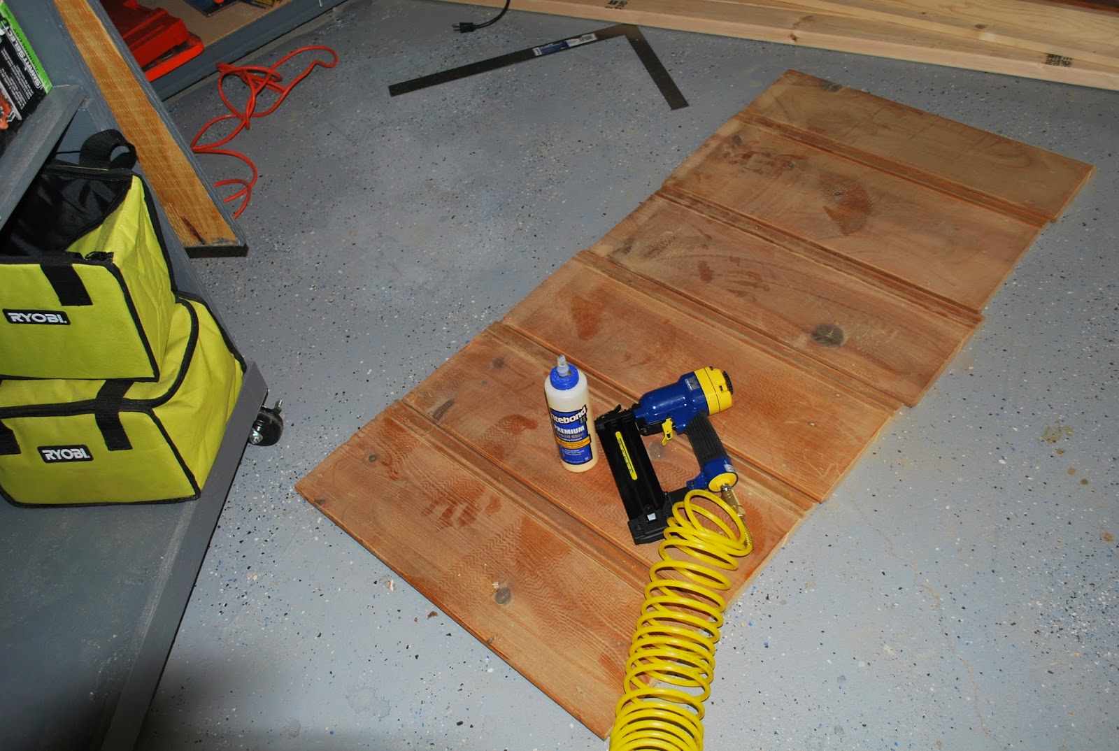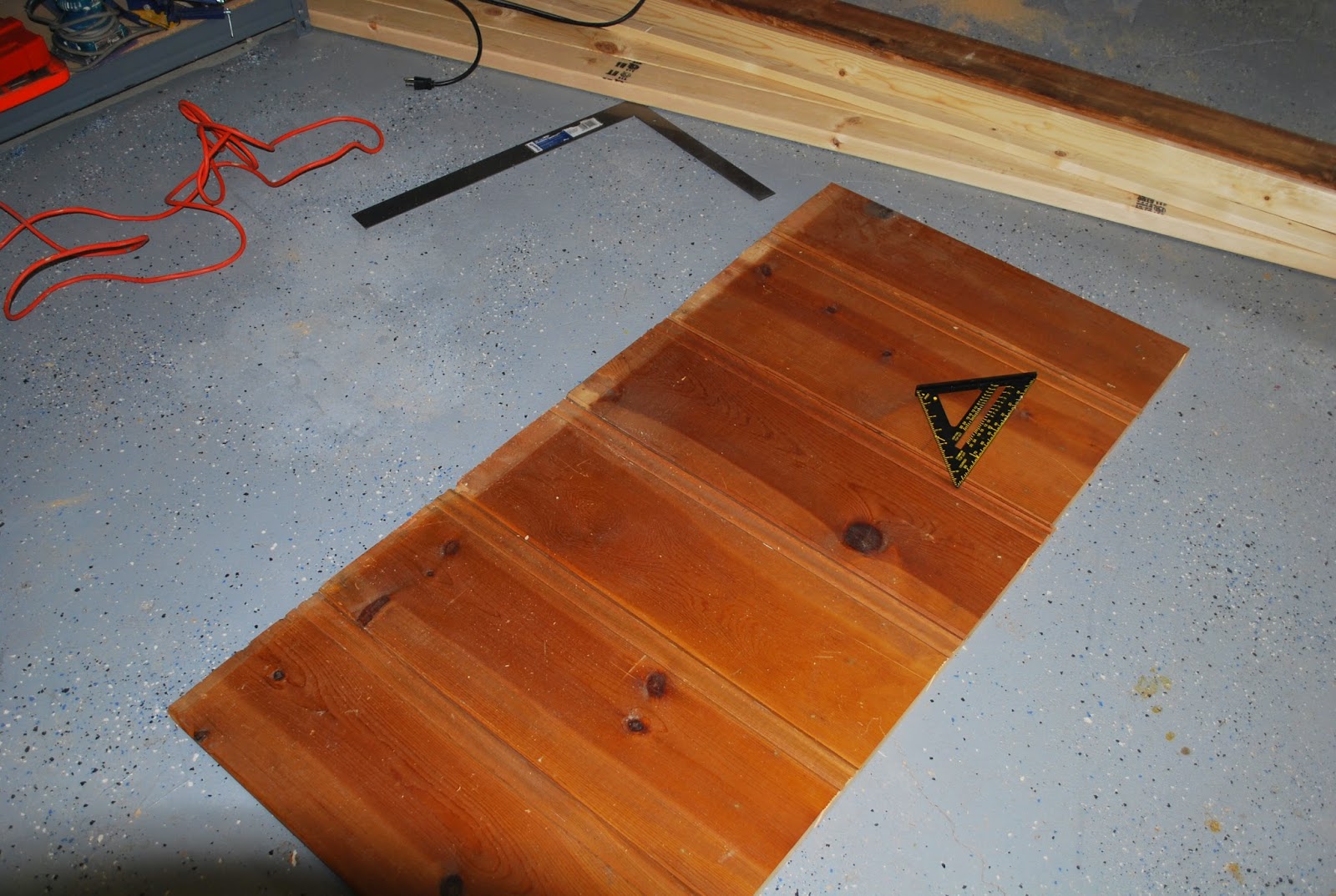 Lay out the wood paneling to measure and cut down to 55″ wide and each board down to 26″ in length. To achieve uniformity when cutting down to the 55″ panel width, cut evenly the two end panels.
