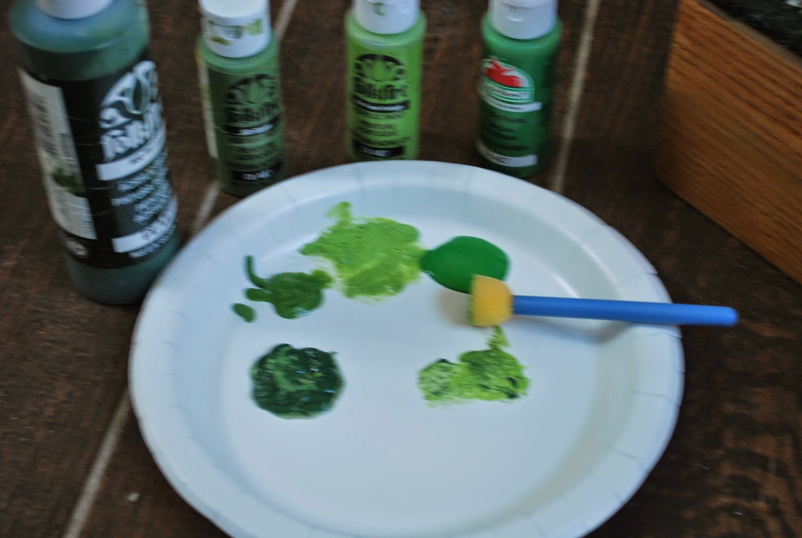 Once the planer box was repaired I turned my attention to the floral bed. This is a simple greenery. It’s attached to the planter box by a large piece of foam. In a disposable plate I mixed the shades of greens and black. Using the stencil brush blot the foam with the paint mixture filling in all the holes and white areas that were missing pieces of the arrangement.